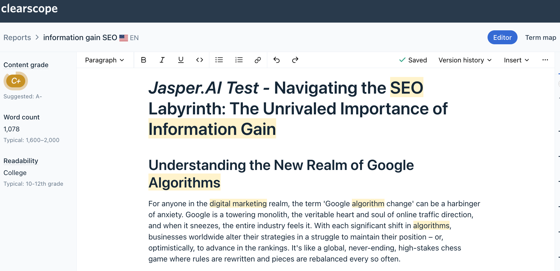 A test of Jasper's generated content in the Clearscope Drafts tool. It currently has a B- grade for meeting search intent. Not bad, but there's still quite a bit of human editing needed here for top SEO performance.