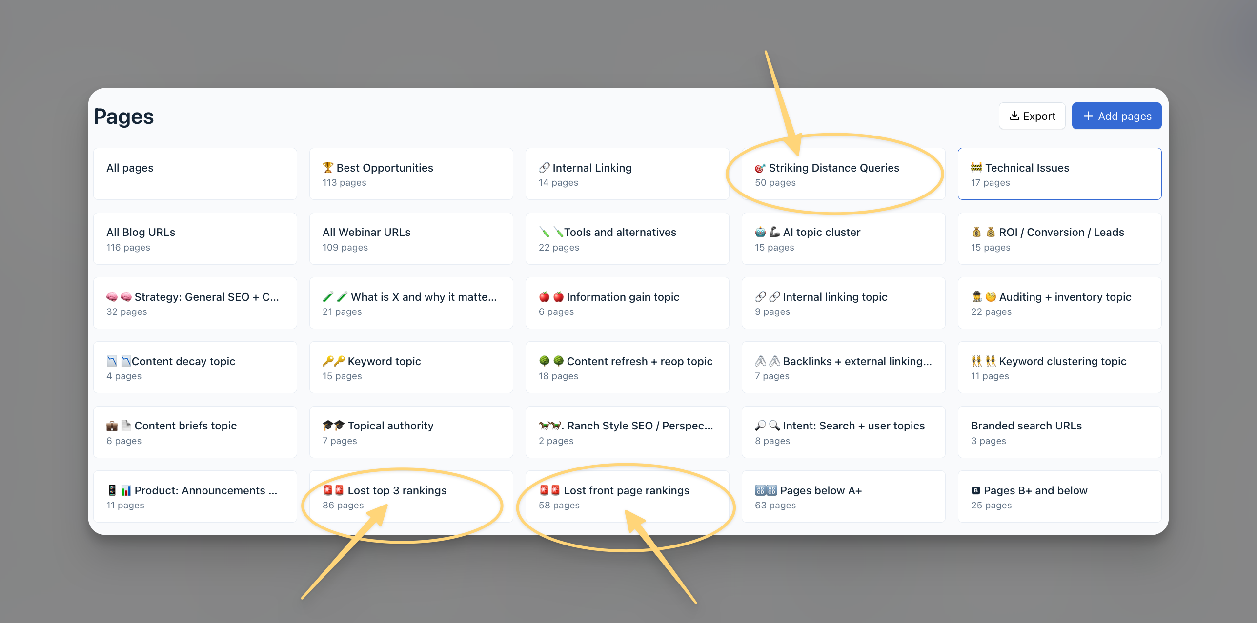 The Striking Distance Queries view notifies you of pages that could rank for additional search queries with just a few adjustments. In my own Clearscope Content Inventory, I've also created a couple custom views that alert me to when a page drops out of positions 1-3 and 1-10 to use during the high growth and peak content lifecycle stages.