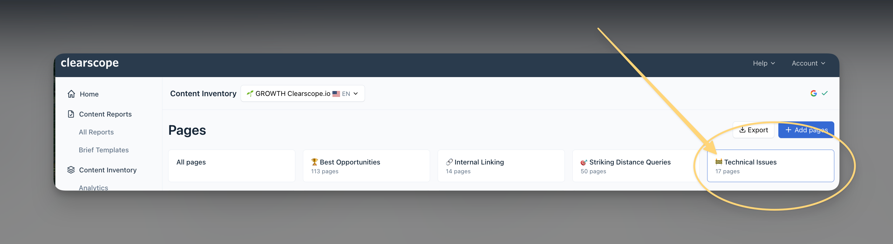 Clearscope also makes this kind of monitoring super visible and straightforward via the Technical issues content view.