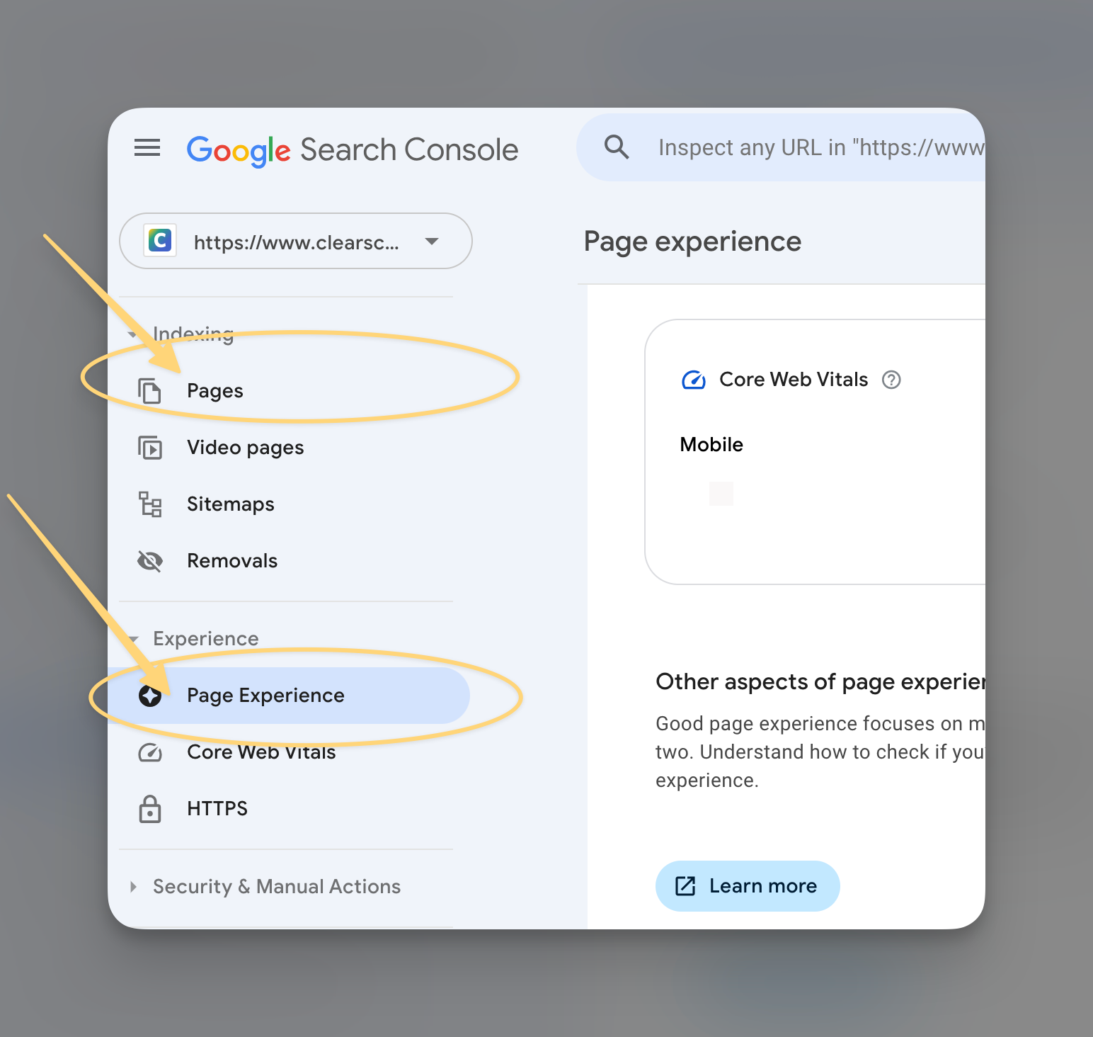 You can find technical issues that are affecting your site's SEO performance with Google Search Console via the "Indexing > Pages" tab and "Experience > Page Experience" tab.
