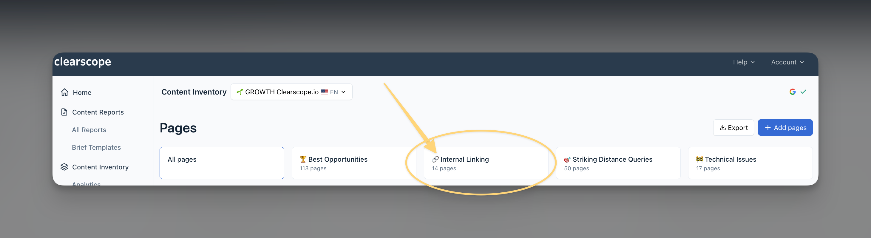If you use Clearscope, your Content Inventory will automatically provide you visibility into internal linking opportunities across your site. (To do so, just make sure you're monitoring the page in Clearscope.)