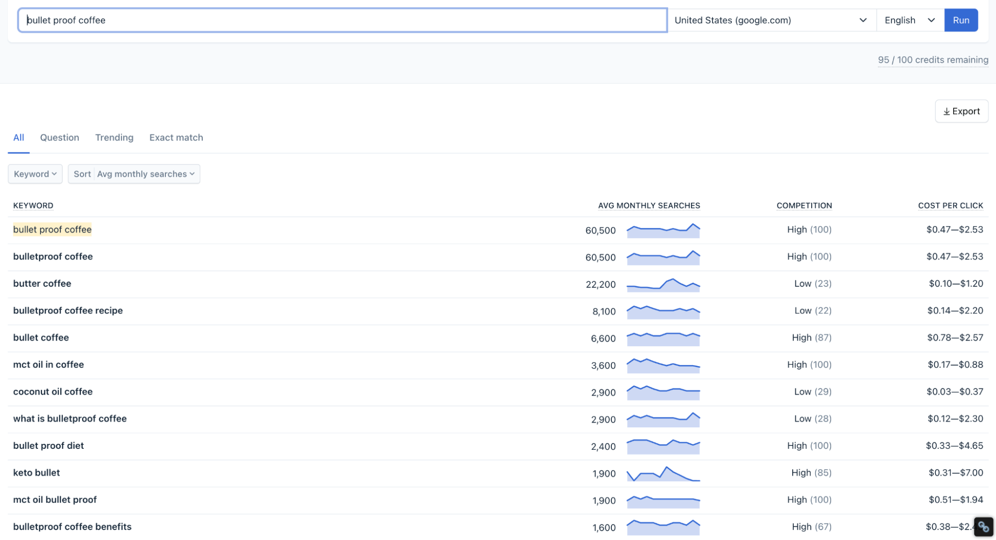 We’ll review tips and tricks to find keywords to seed your content. Let’s say you are a software as a service (SAAS) company that delivers bulletproof coffee straight to people’s doorsteps.