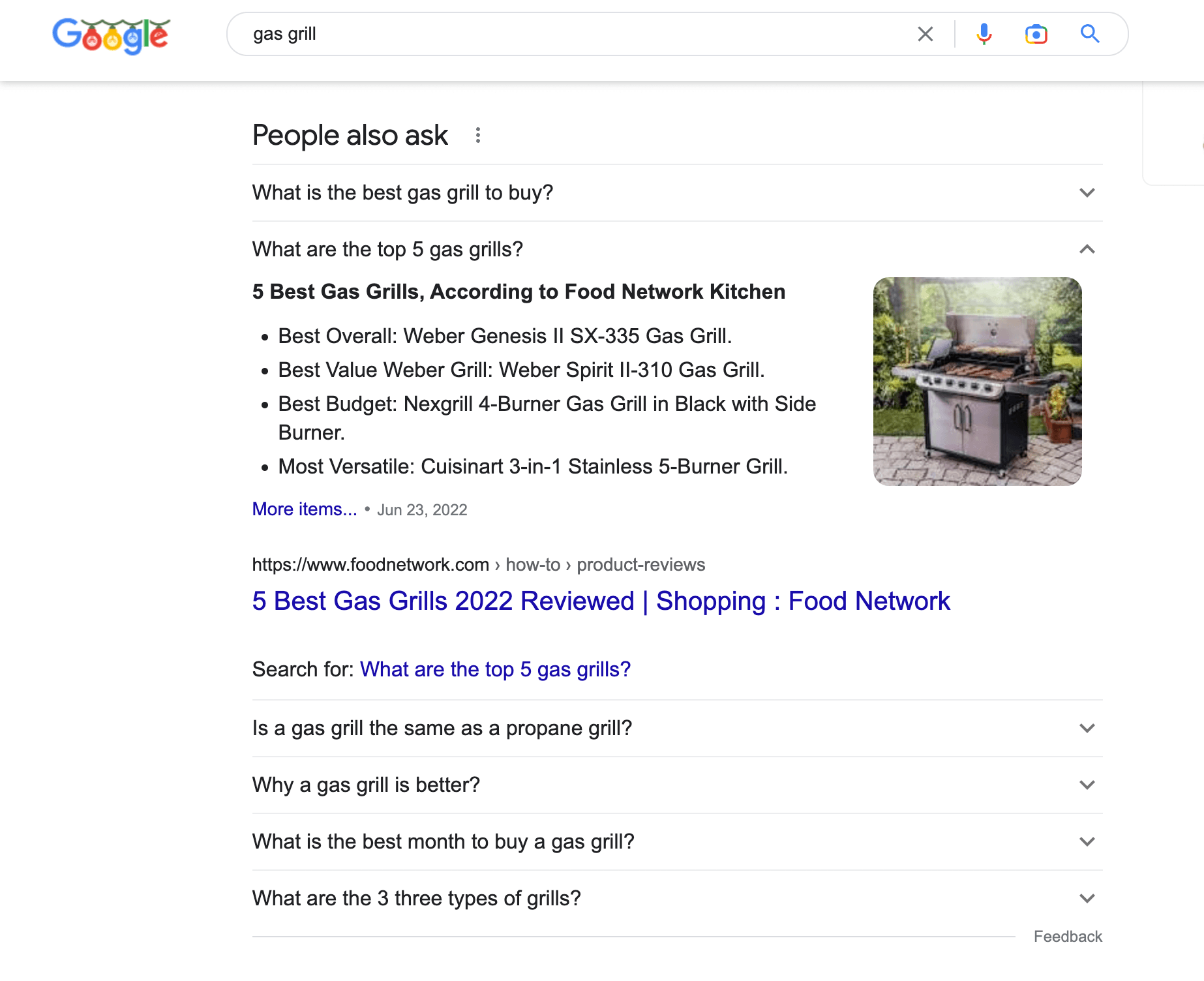 If you run a Google search for “gas grill,” you’ll see featured snippets or a section called “People Also Ask.”