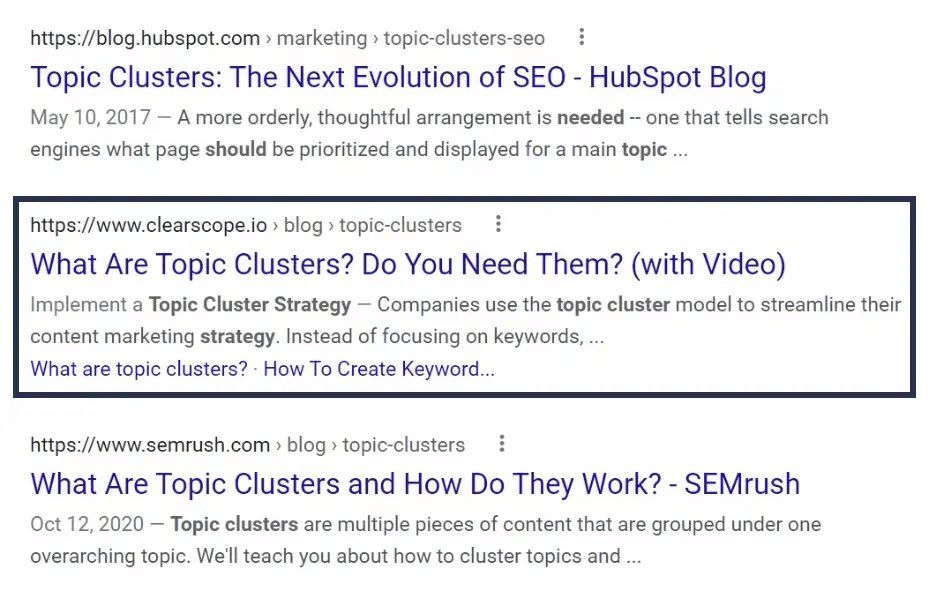 For example, from Clearscope’s article “Topic Clusters: What Are They? Do They Help Your SEO? (with Video),” Google picked up two anchor links and presented them as sitelinks on the SERPs for “topic clusters.”