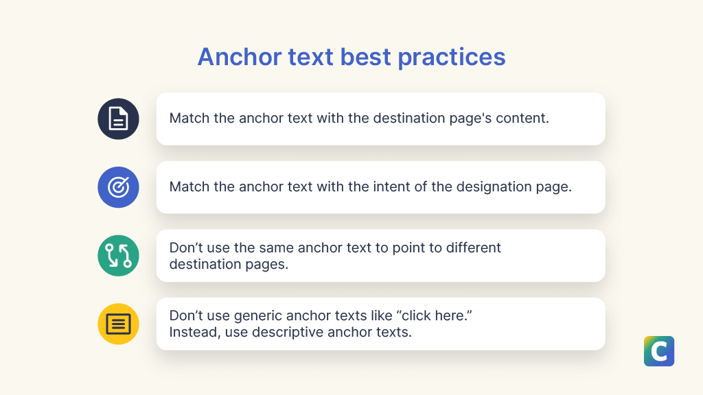 - Destination’s intent: The anchor text should also match the destination article’s intent. If the anchor text has the words “how-to guide,” the reader will expect a step-by-step guide on the destination page. Visitors might feel cheated if the destination is a “pros and cons” article.