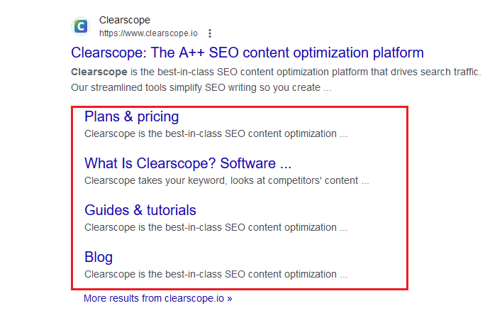 For example, if you search for “Clearscope” on Google, the first result is a link to the Clearscope homepage, along with sitelinks to the main landing pages.