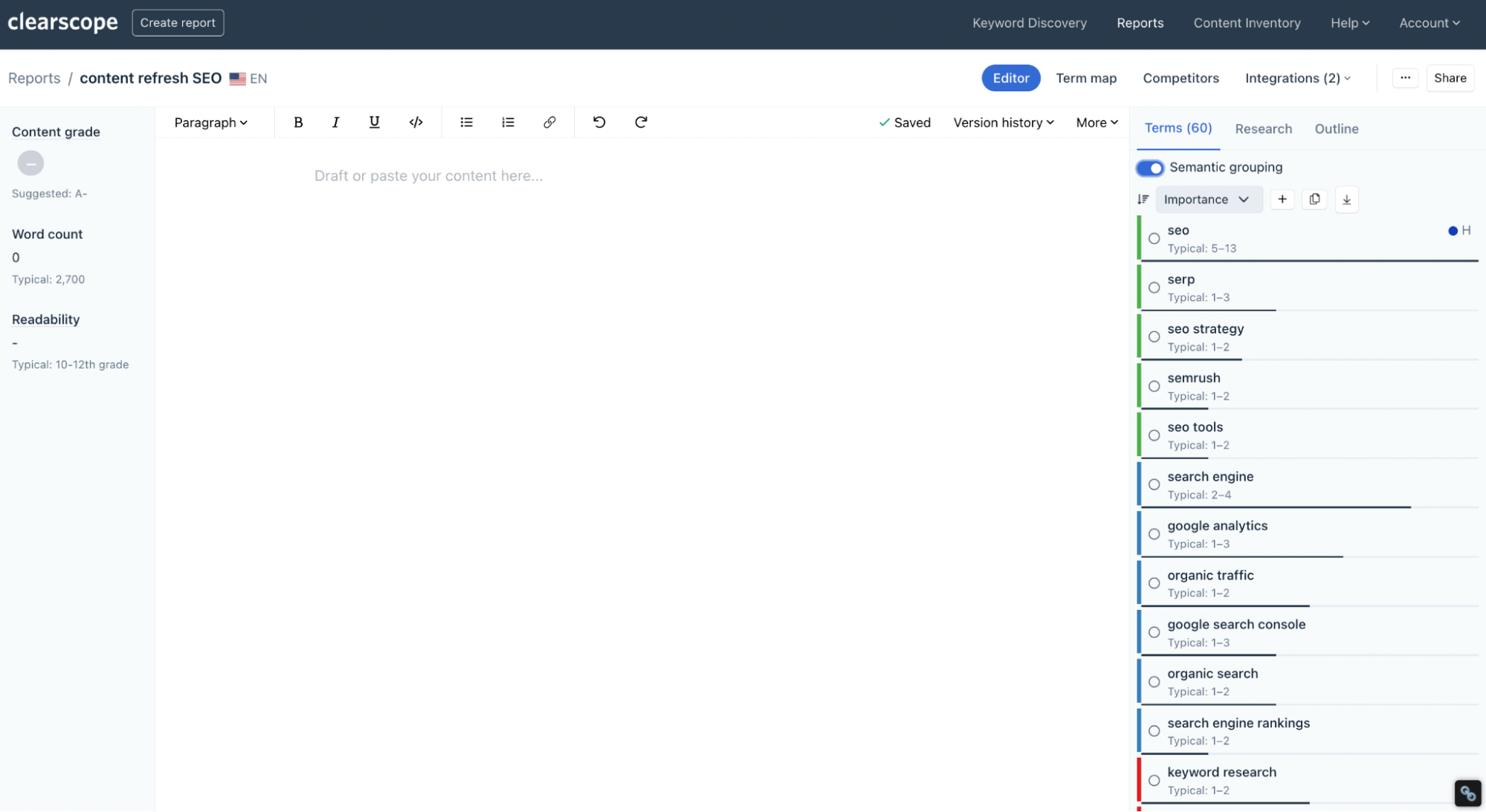 Drafts enable strategic content creation because they show you what to focus on as you outline, draft, edit, and even refresh content. Each report contains a few key elements: