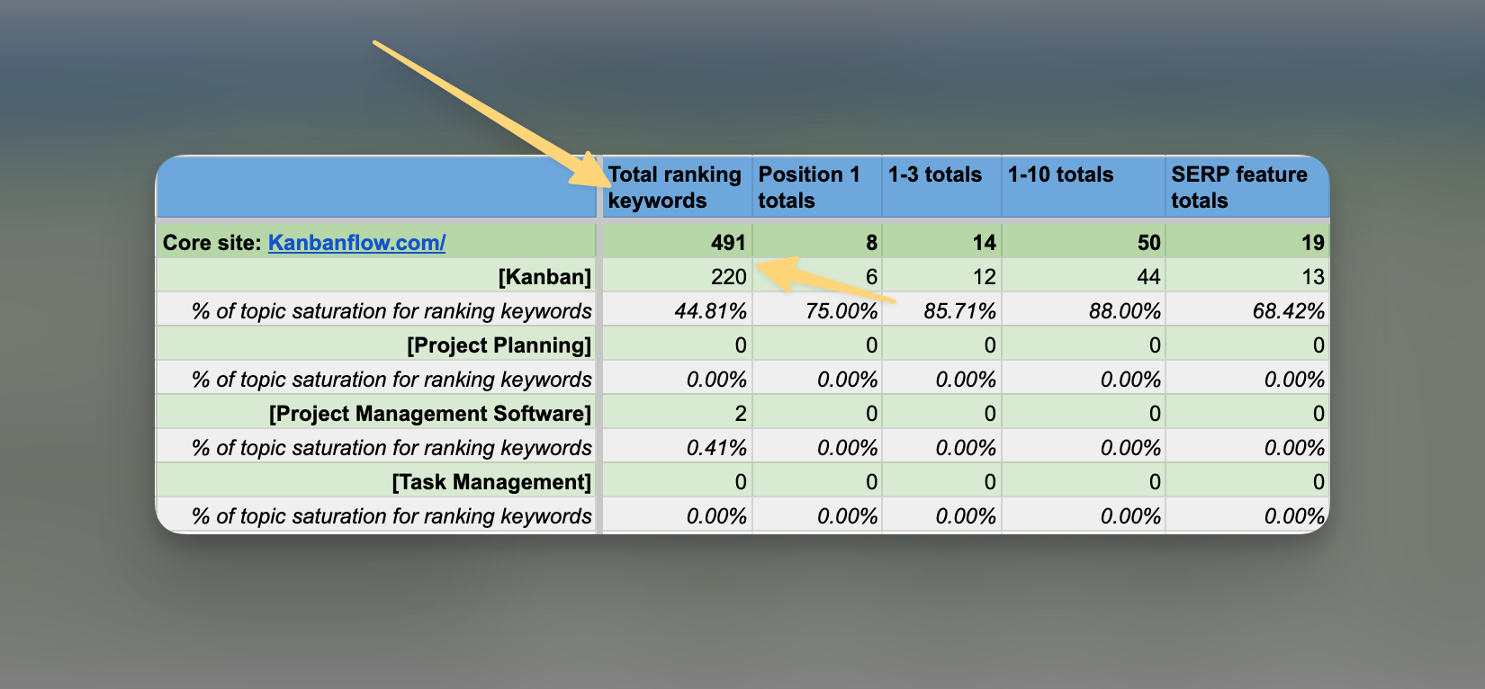 Total count of ranking keywords your site has for your selected topics above in the #1 position, 1-3 positions, 1-10 positions, and any SERP features