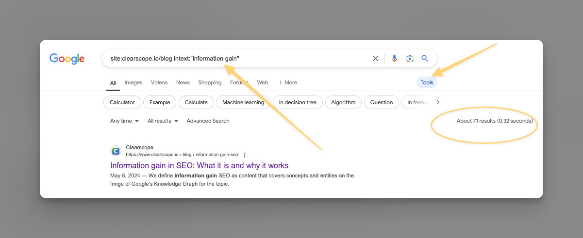 You’ll need to click on “tools” in your Google search results to see the number of your pages indexed by subdirectory and domain, filtered based on your topic specifications.
