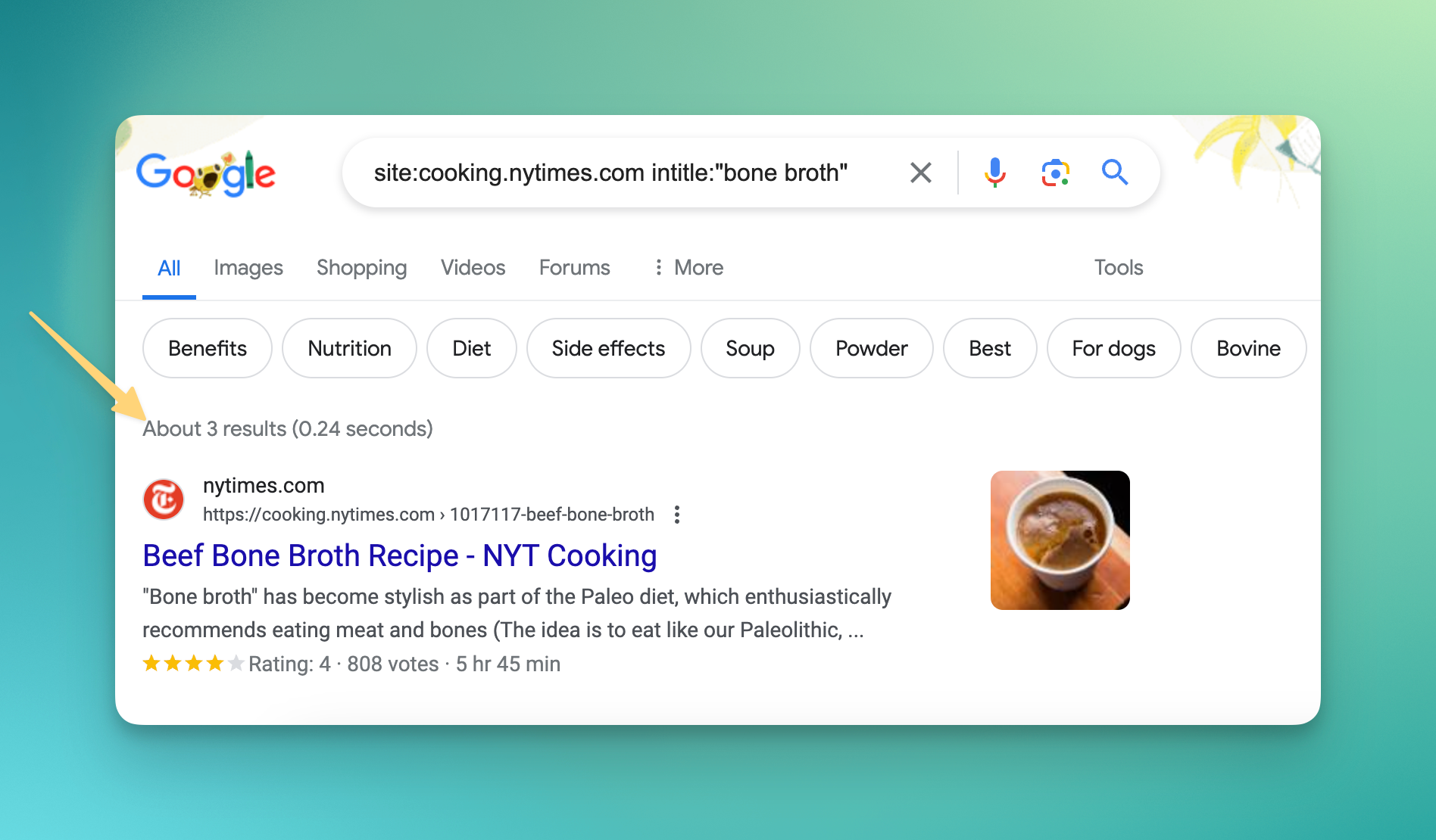 For a quick example, just take a look at the amount of [bone broth] search results Google has indexed for The New York Times Cooking vs. Kettle & Fire, a bone broth producer.