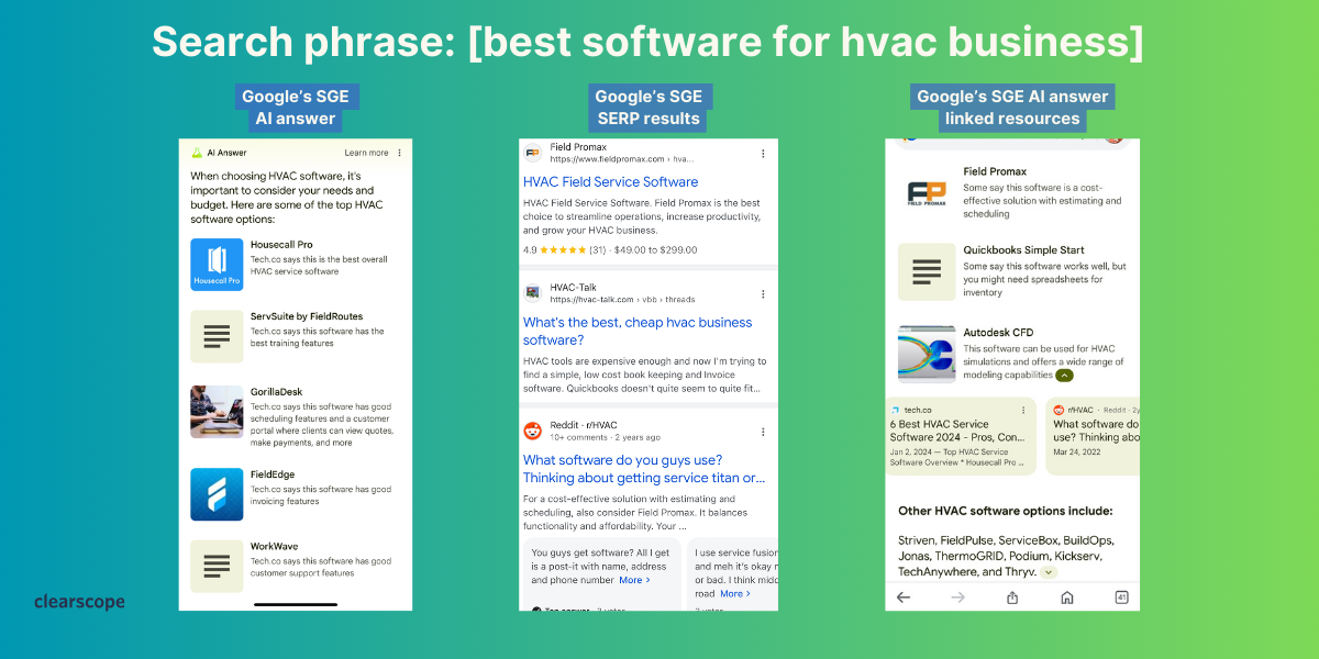 For [best software for hvac business], we see Google provide an AI answer and linked resources that offer perspectives that can offer information gain to the topic at hand, rather than just a list of software options. Further results down Page 1 (under the AI-generated answer) offer perspectives and first-person experience.