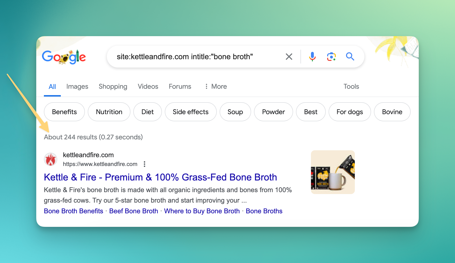 Google shows about 244 pages indexed for Kettleandfire.com for the term "bone broth" in page titles.