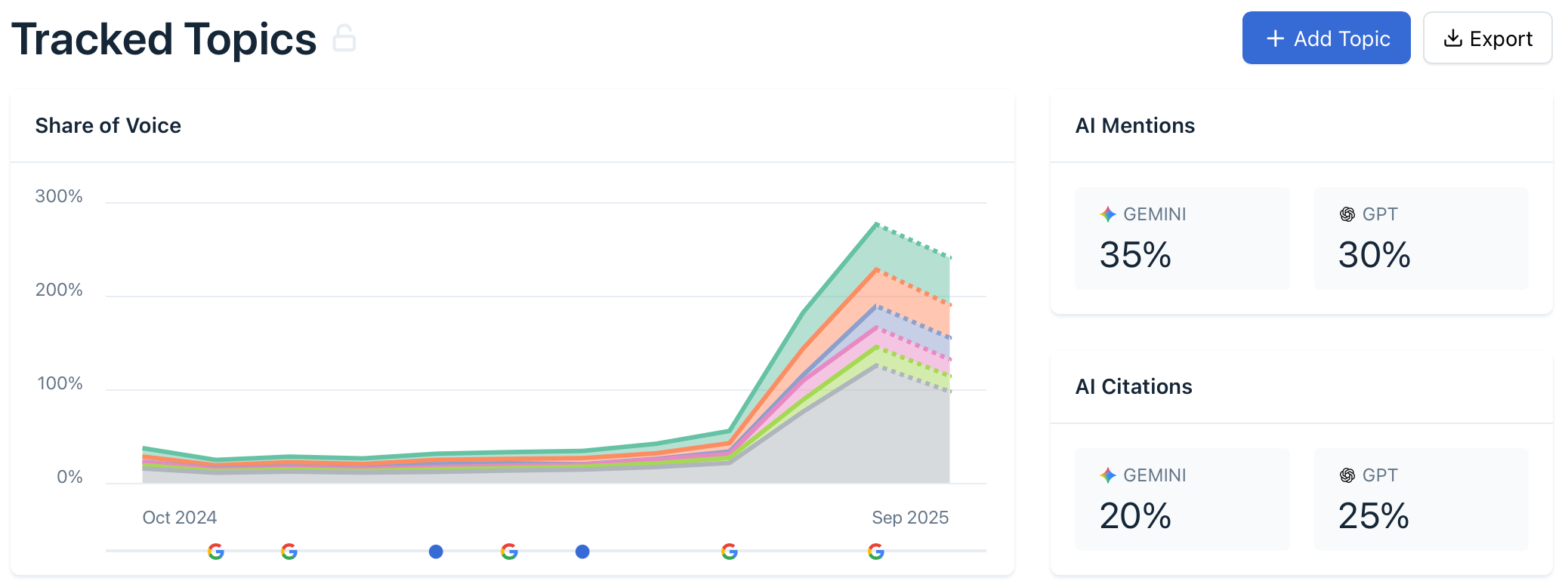 Topic-level Trends: Monitor how interest in a topic is shifting and how your visibility changes over time.