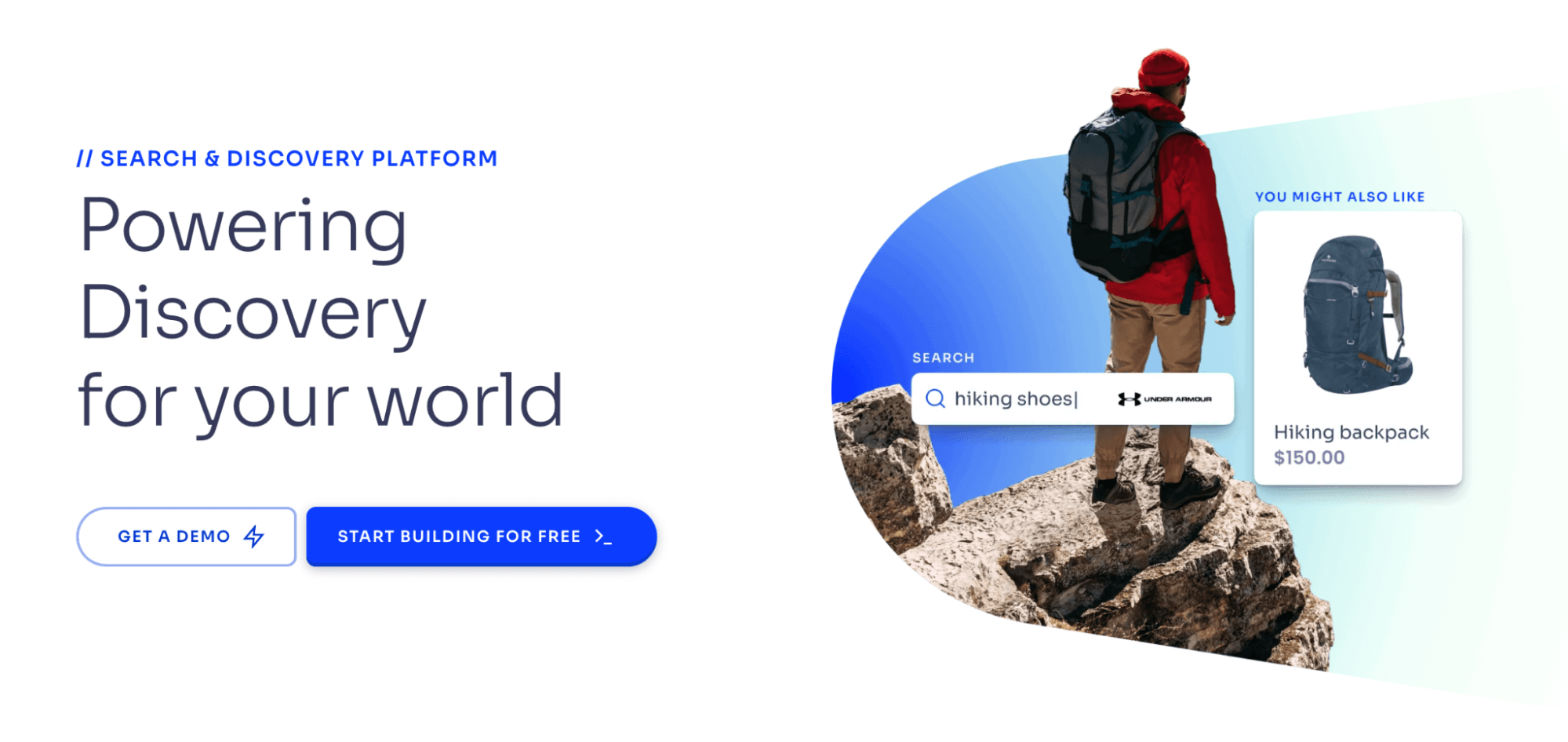Algolia’s homepage, “Powering Discovery for your world.”