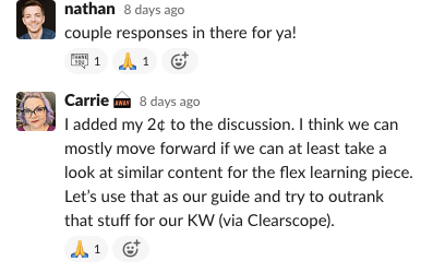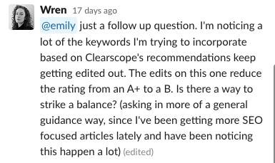This Slack conversation shows how a writer at Animalz uses Clearscope to ensure that essential SEO terms aren’t edited out of her work.
