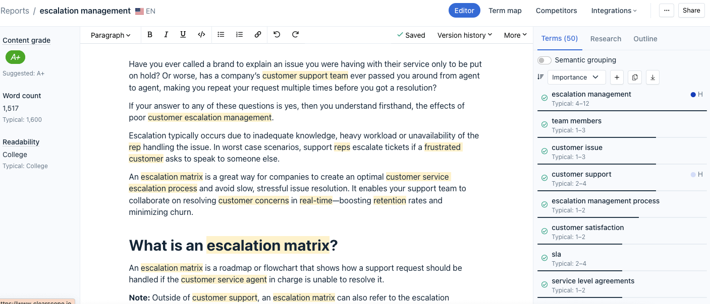 For example, a writer might include specific terms in an article to help it rank. But an editor might end up removing words because they don’t fit the flow or structure of the article. Clearscope solves this problem by putting everyone on the same page about the terms.