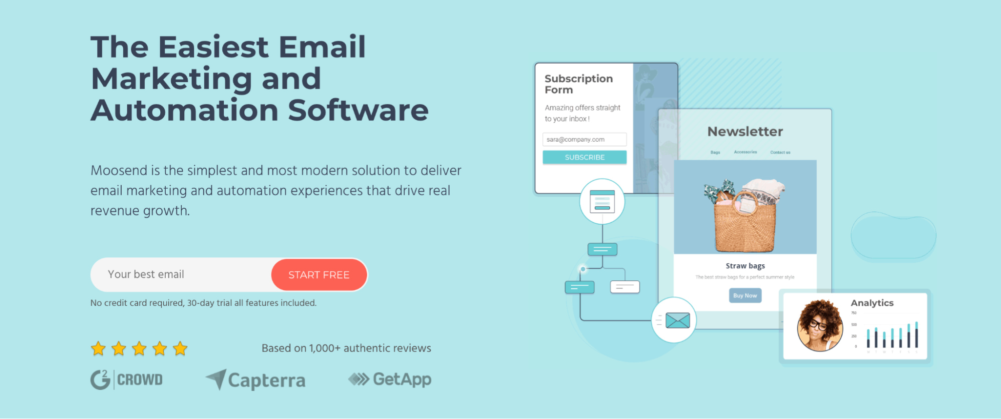 Moosend is a modern email marketing and automation solution that drives revenue growth for e-commerce brands, publishers, and content creators. The platform offers newsletter management and personalization, a CRM tool, landing pages, e-commerce artificial intelligence (AI), and marketing analytics tracking.