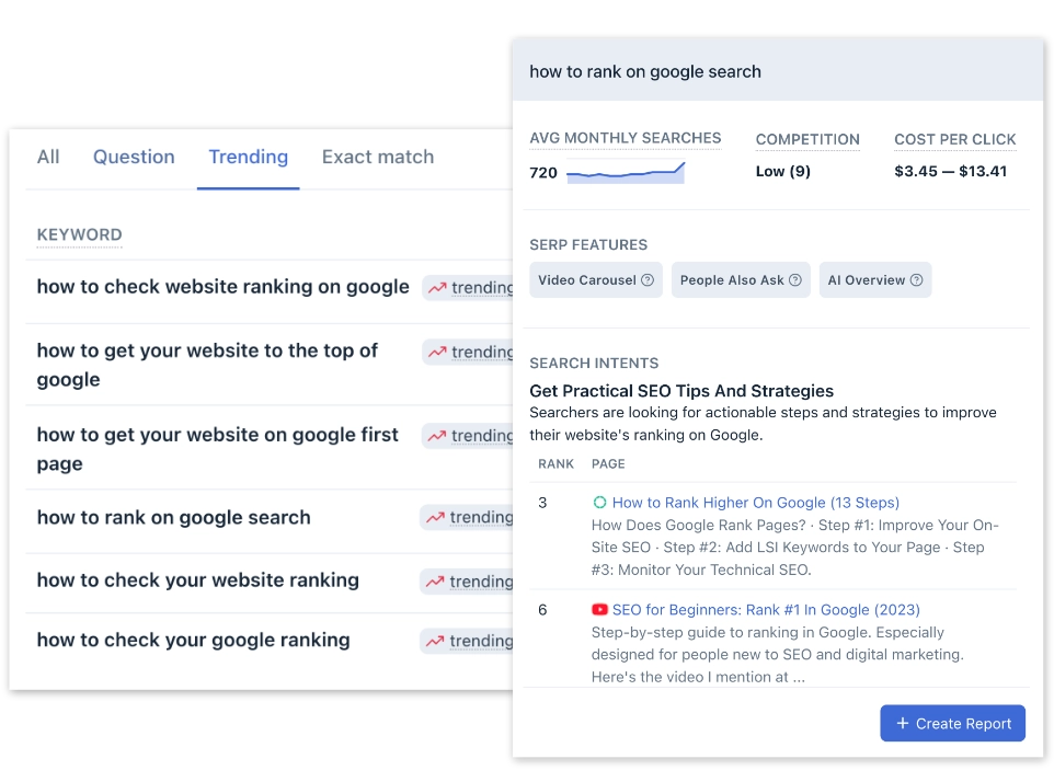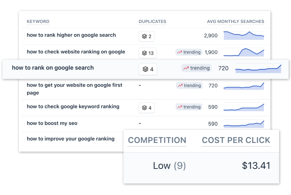 Gain valuable metrics, including Google Ads competition and cost-per-click data, to inform your content and paid search strategies.