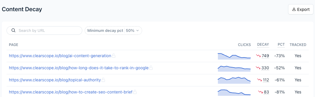 Our Content Decay feature highlights your content that’s lost the most clicks over the past year. Showing you what pieces of content have decayed better positions you to refresh the page (using our Content Reports, of course) and drive more traffic back to the URL.