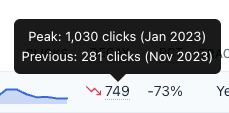The absolute value of clicks lost from the peak month (highest click traffic) and previous month (last full month)