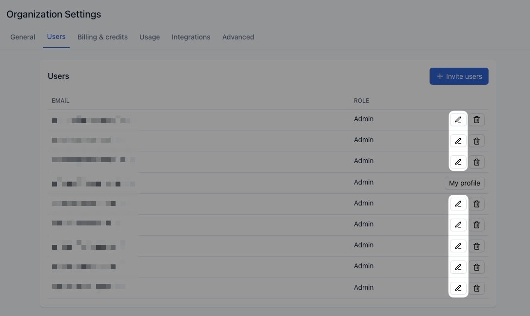 4. To change a user’s role, select the writing icon to the left of the trash can icon