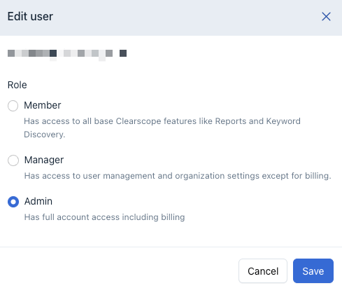 Note: If you are not an Admin user and the only Admin user is no longer with your organization, please reach out to support@clearscope.io and the Support team will be happy to help.