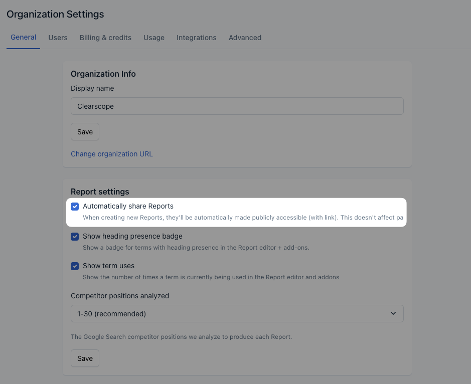Clearscope Drafts must be toggled to “Shared” to work with the Google Docs add-on. Users with the Admin role can make any new Clearscope Drafts automatically “shared” by visiting their organization settings.