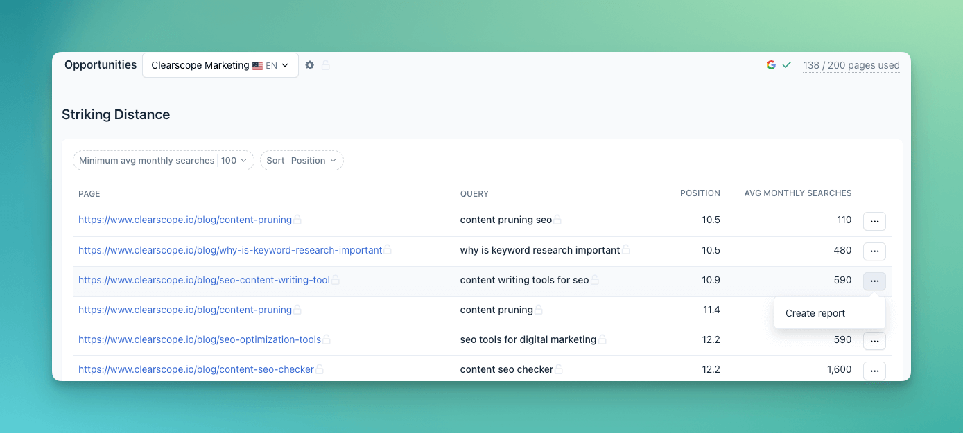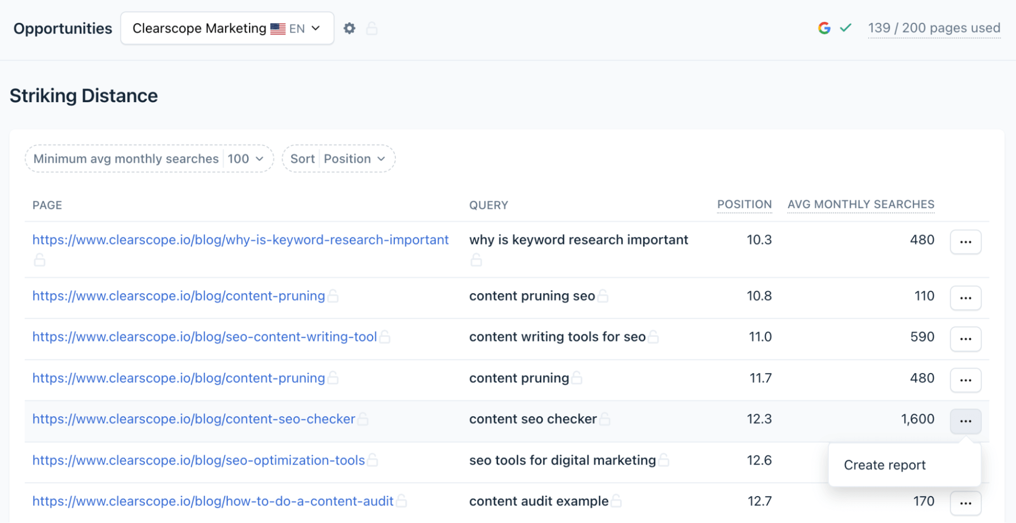 You can quickly generate a Content Report from the Striking Distance screen by selecting the “...” button and clicking the “Create report” option from the drop-down menu.