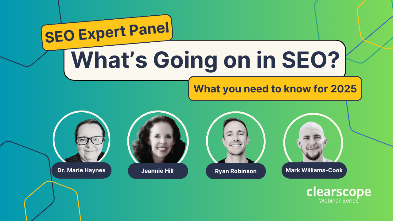 In this session, Clearscope's Bernard Huang hosts industry-leading SEO pros Marie Haynes, Ryan Robinson, Mark Williams-Cook, and Jeannie Hill for a fun, insightful “Ask Me Anything” (AMA) style live panel.