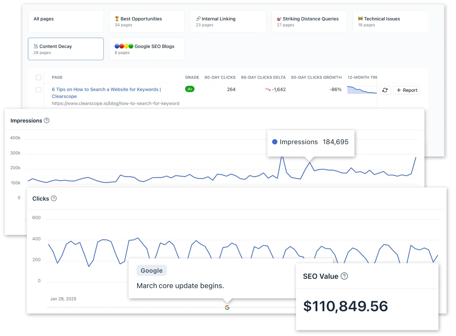 Protect traffic with powerful content analytics for your entire site or individual pages. Use pre-built content views or custom ones for a deeper dive into your content's performance.