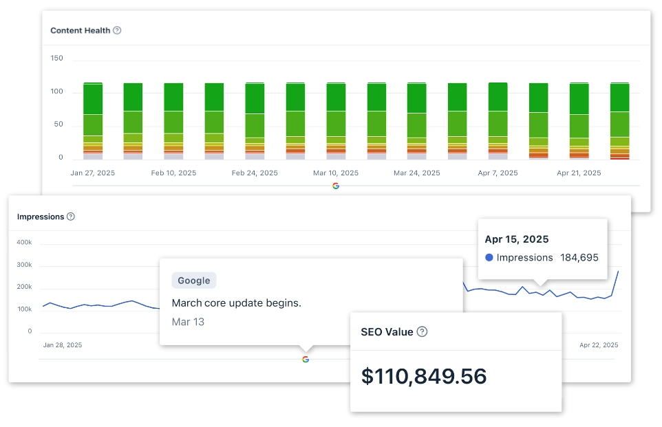 Protect traffic with powerful content analytics for your entire site or individual pages. Use pre-built content views or custom ones for a deeper dive into your content's performance.