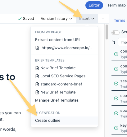Within your Clearscope Report, select "Insert" and then "Create Outline" from the menu.