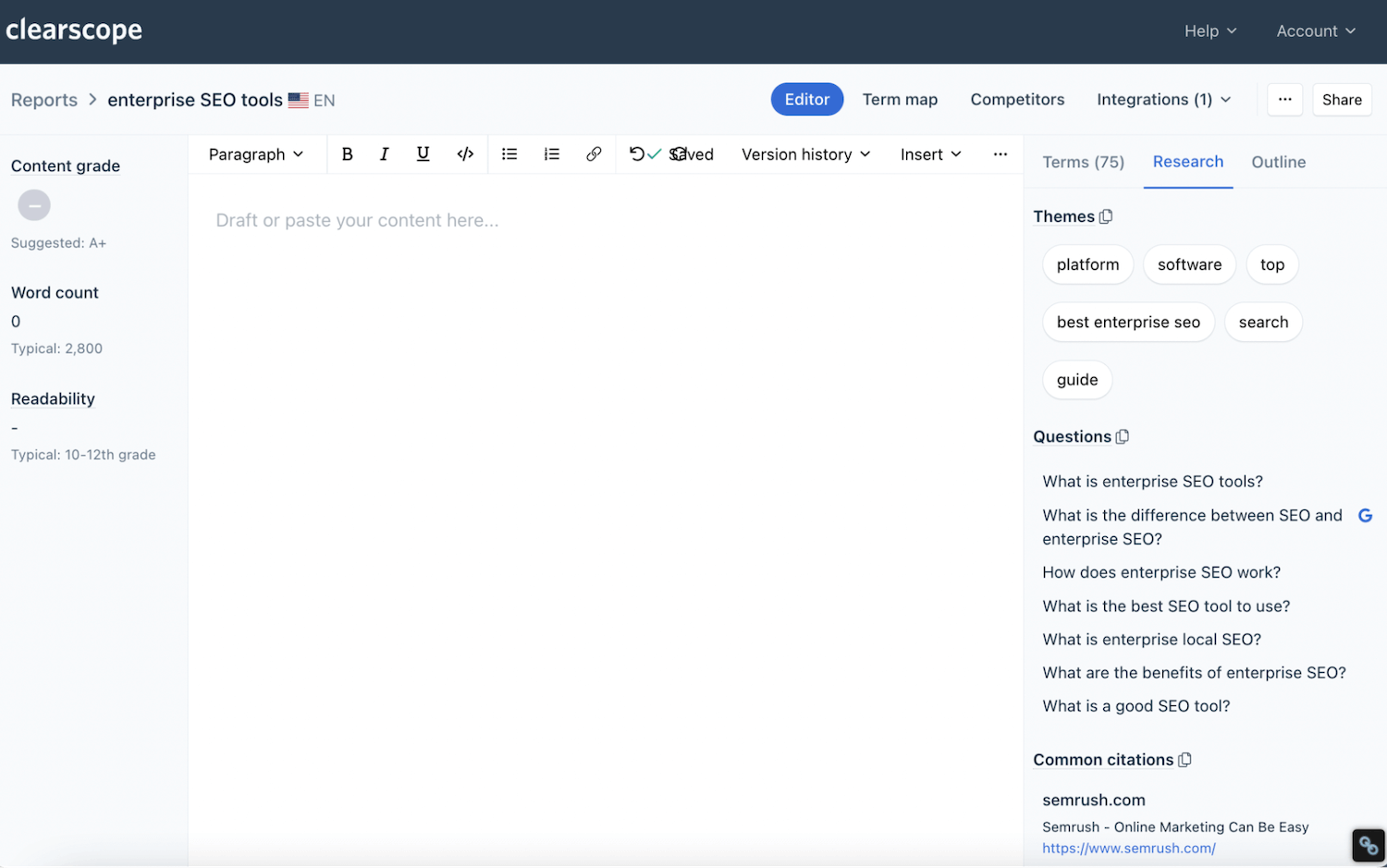 Clearscope’s SEO reports provide insights to help organize a clear, strategic outline.