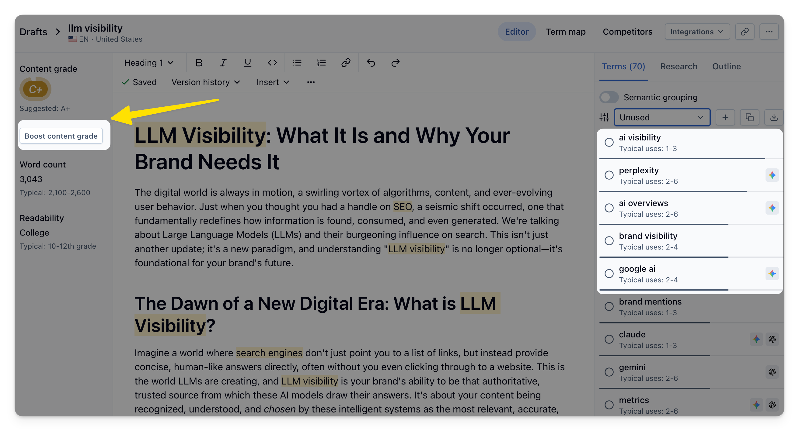 Today, we’re introducing Boost Content Grade, a one-click feature designed to close that final gap and help teams reach their target content grade with greater speed and confidence.