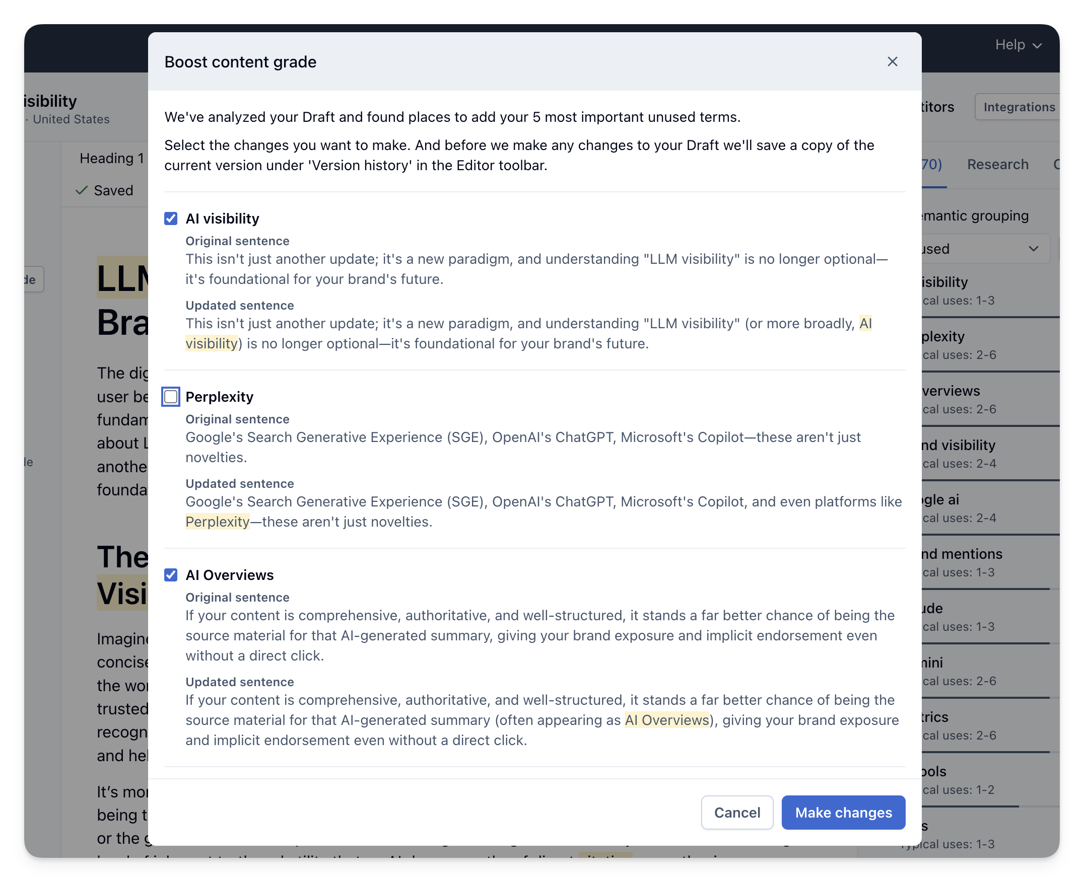 Maintain writing quality while improving coverage: Because terms are placed contextually, the flow of the article remains intact. Optimization enhances the draft rather than interrupting it.