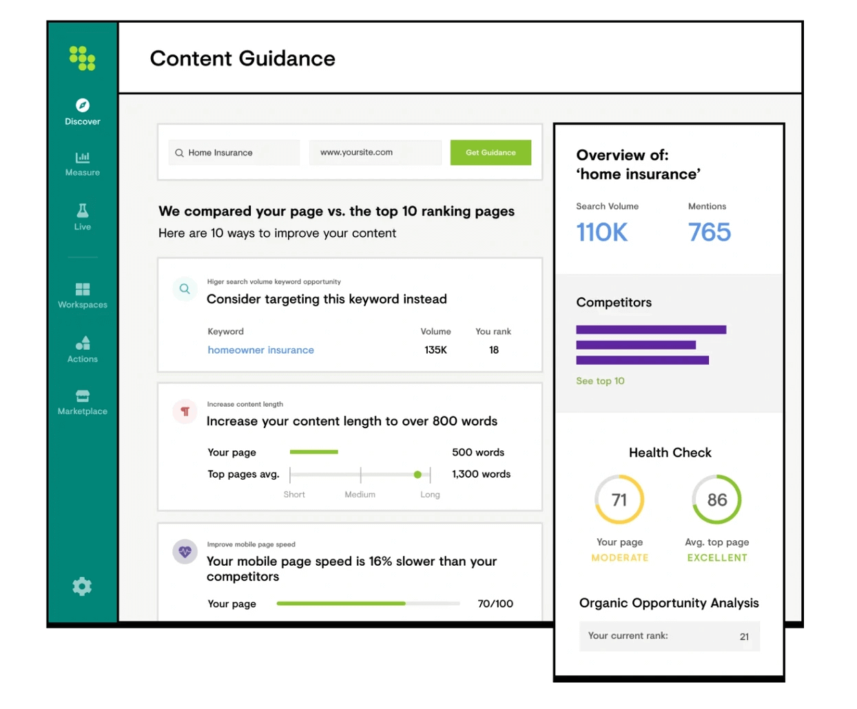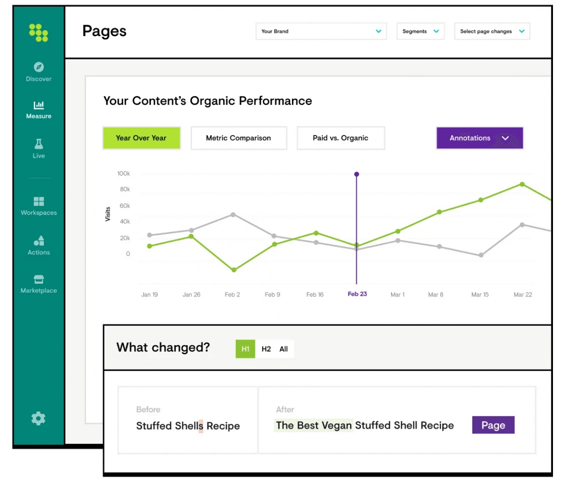 BrightEdge focuses on search engine results pages (SERPS) and data. While it does highlight which pages are bringing in visitors and will make suggestions based on the data, it doesn’t offer much else.
