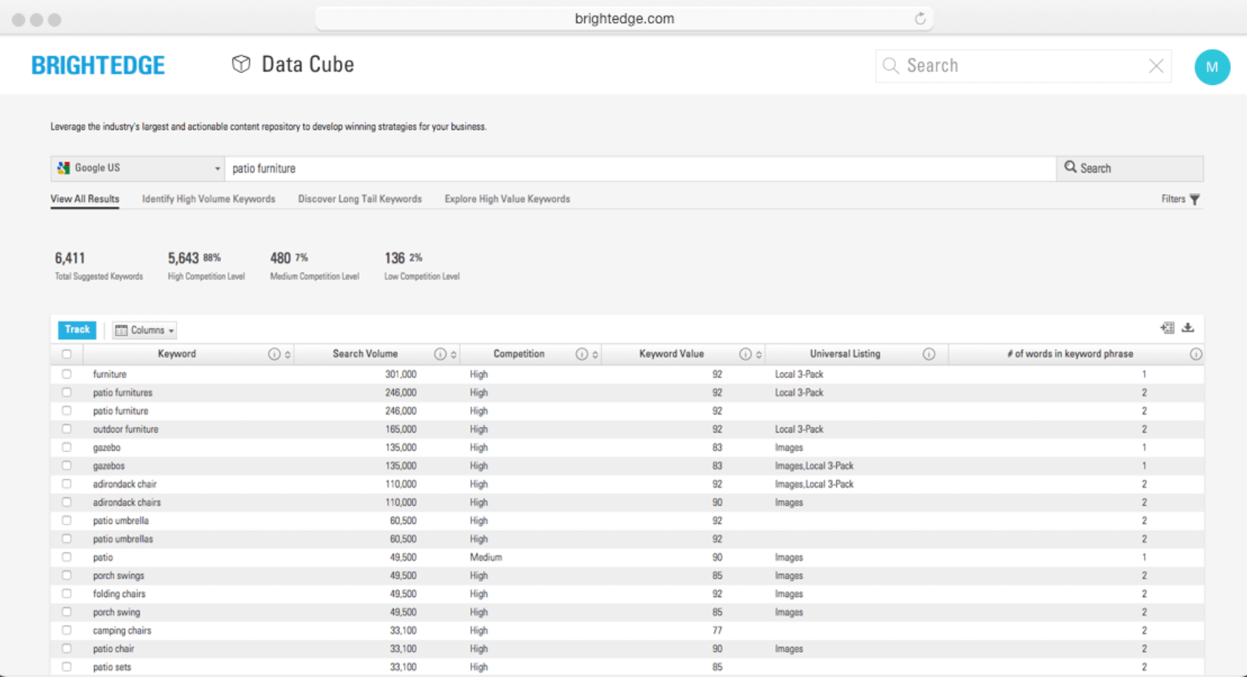 BrightEdge breaks its SEO software down into separate tools. For keyword research, you’ll use Data Cube. The tool shows what keywords your website ranks for and those your competition ranks for.