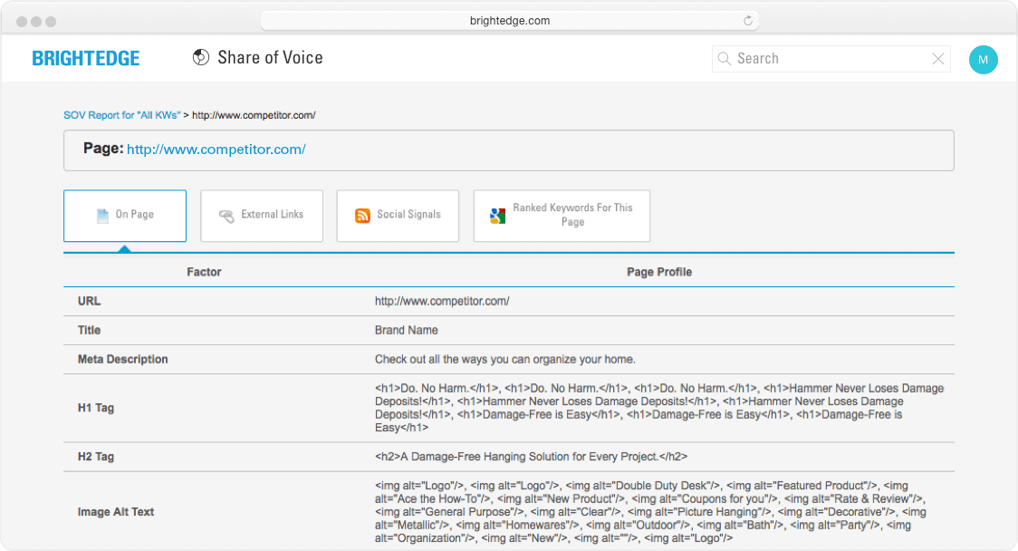 BrightEdge offers competitive analysis with Instant, an AI-powered tool or Share of Voice. These programs work for general search engines and platforms like Amazon and YouTube. The level of detail they provide helps BrightEdge squeeze above Conductor in this category.