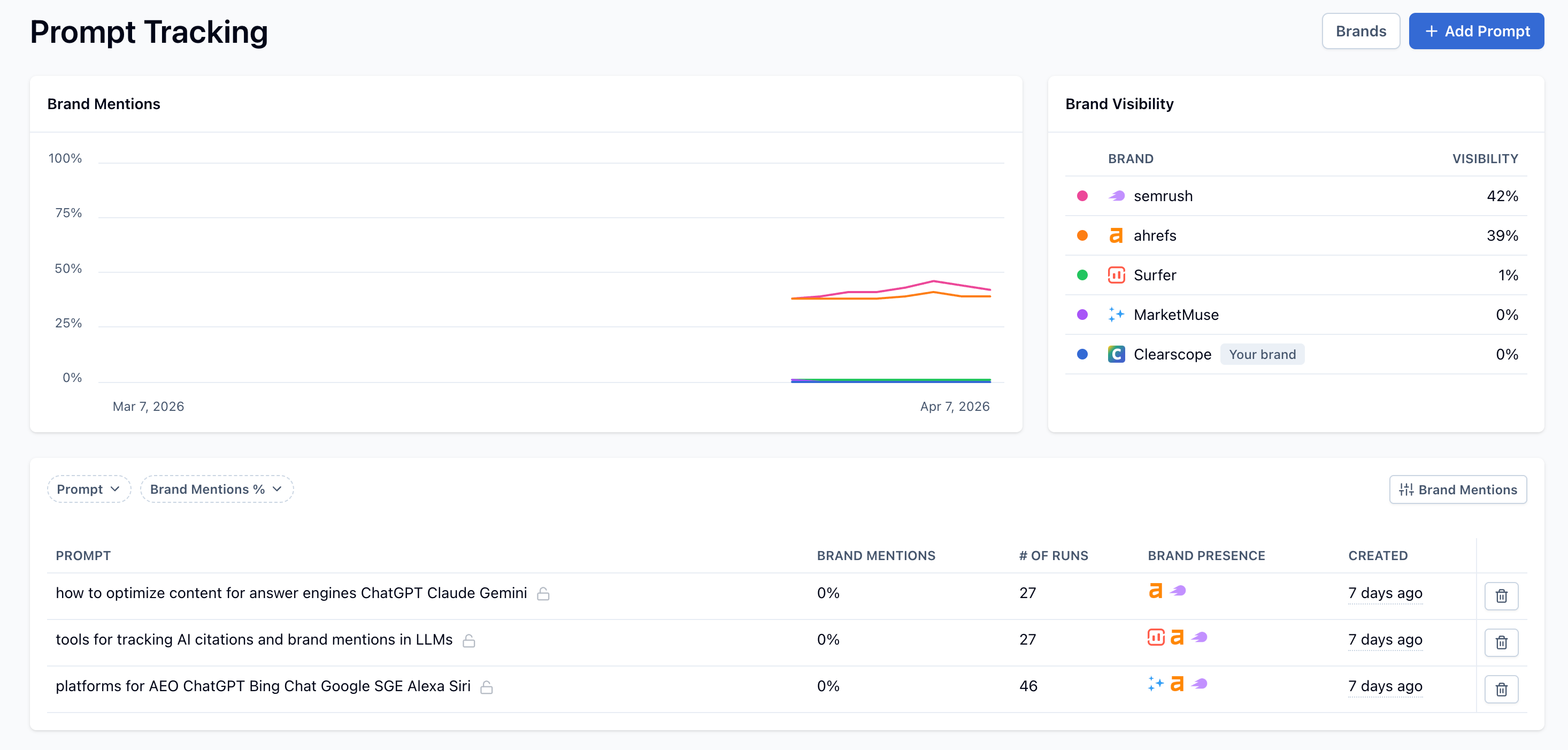 Clearscope's Prompt Tracking feature lets you run any prompt at scale across AI platforms — hundreds of times — and measure how often your brand appears in the responses. It's the closest thing to a brand mention rate metric that exists for AI-generated answers right now.