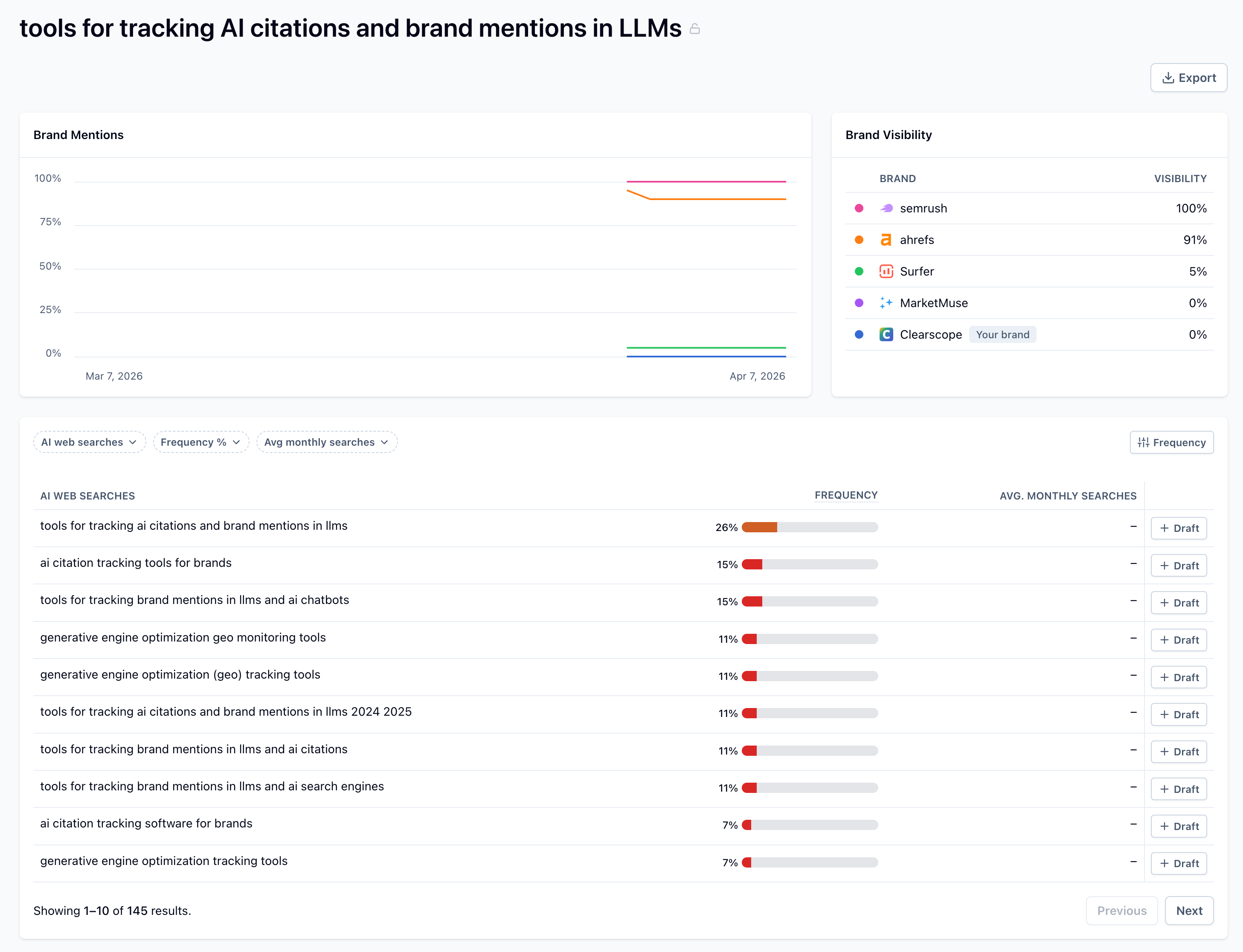 Brand mention rate per prompt — the percentage of AI responses that include "Clearscope"