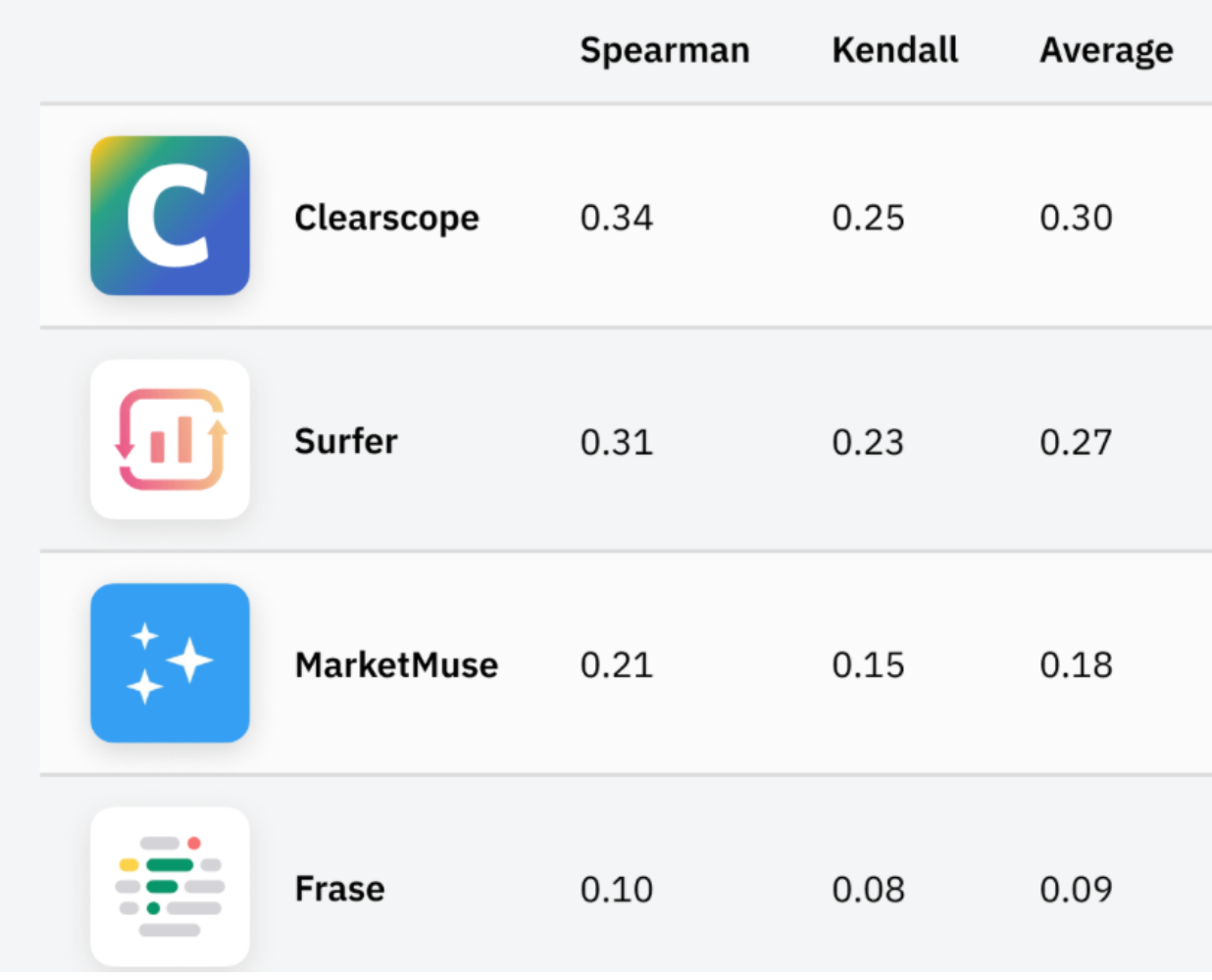 What is transparent? This: Ahrefs, a third-party platform with no skin in the game, ran its own study and found Clearscope outperforming Surfer in both correlation models: .30 vs .27.