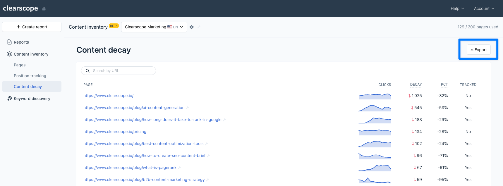 5. Export a CSV of your Content Decay information by selecting the "Export" button in the top right