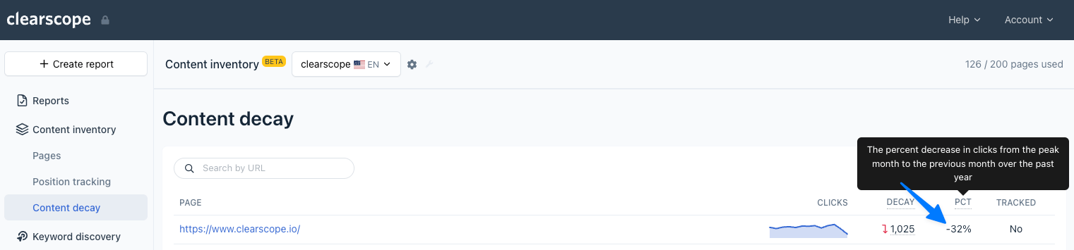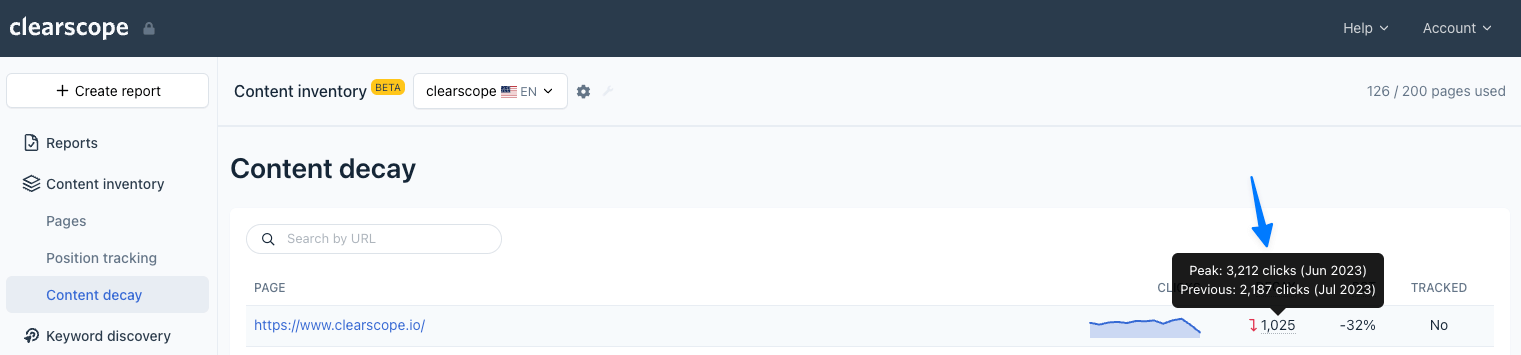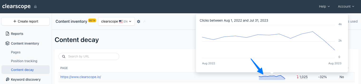 Content decay refers to a decline in organic search performance, specifically a decrease in the amount of clicks to a page from its peak. These drops in performance are subtle and can easily go unnoticed, so it’s important to have a way to uncover when content decay is happening to avoid significant losses over time.