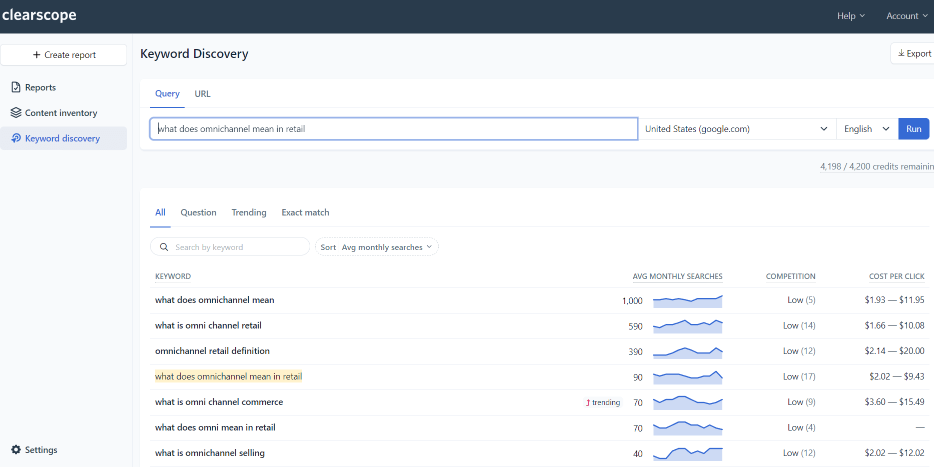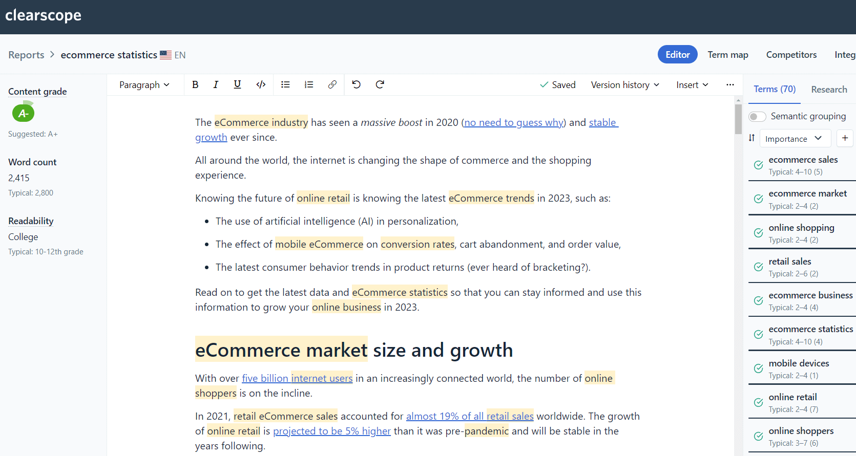 For example, Clearscope generates reports for individual content pieces that include data-based recommendations on related keywords, heading keywords, word count, and reading level.