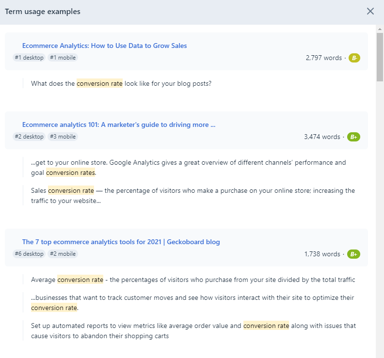 For example, in the Clearscope Editor, you can select a keyword and view examples. The tool will go through competitor posts and highlight sections of text that use the selected word so you can understand the context of each keyword based on what’s currently ranking.