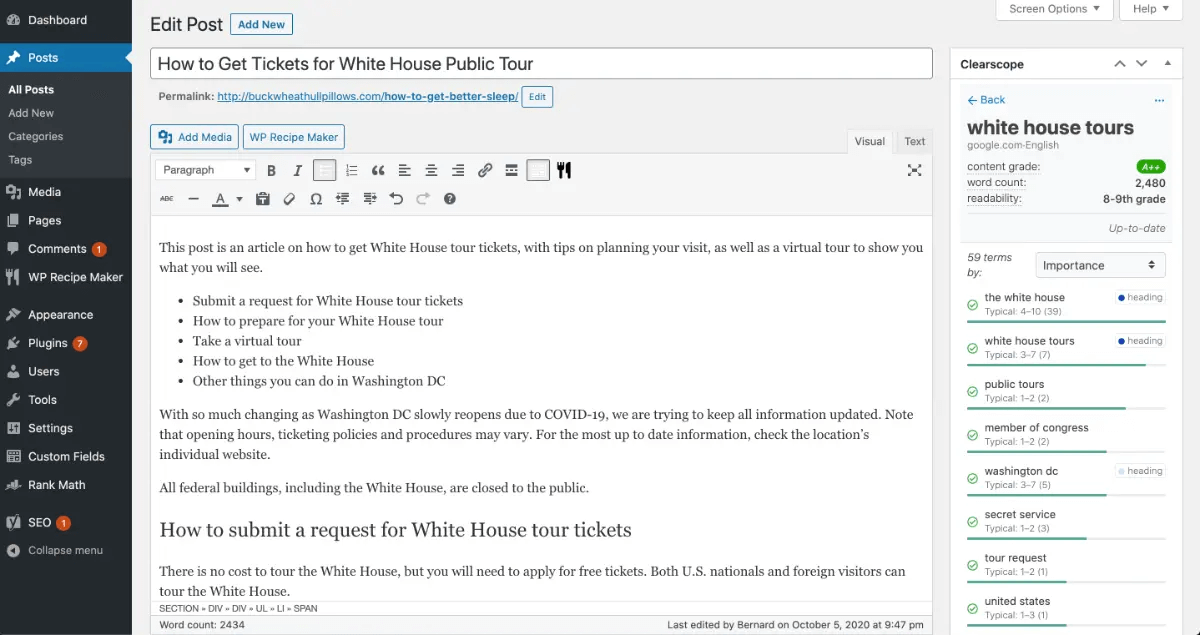 The Clearscope WordPress plugin lets you bring content intelligence into the post editor and live updates your content score and word count.