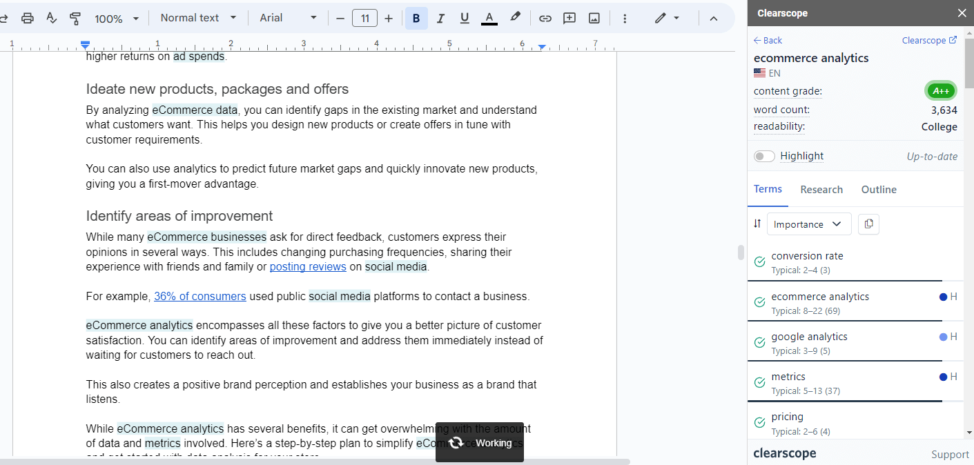 For example, Clearscope offers a Google Docs integration, so your writers and editors don’t need to open another program to get competitive insights.
