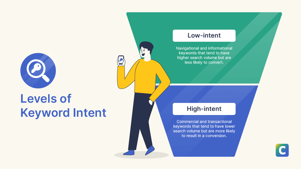 High-intent keywords are more likely to result in a conversion, while low-intent keywords focus more on information gathering.