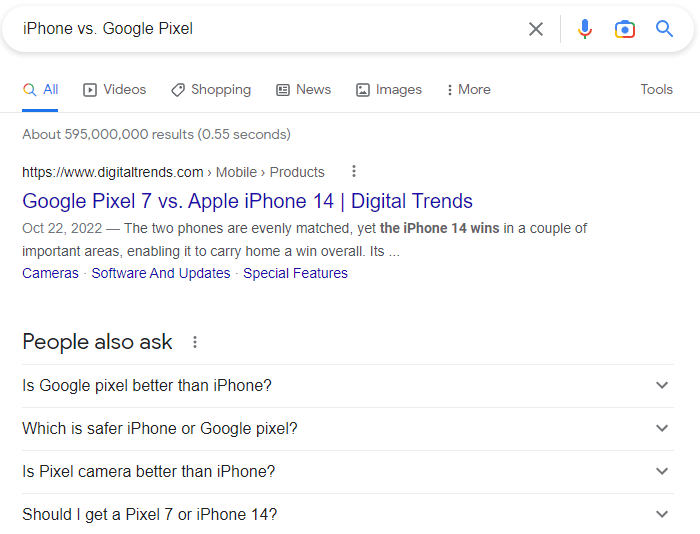 “iPhone vs. Google Pixel” is a high-intent commercial keyword.