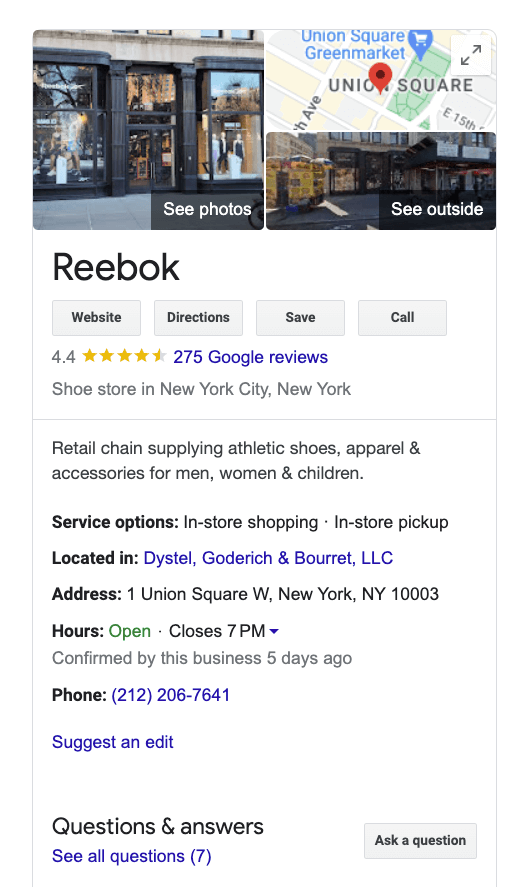 Another way to improve your site’s (overall) performance in search engines is to update your Google Business listing with information about your brand; for example, add contact info and photos, give searchers background about who you are, and answer user questions.